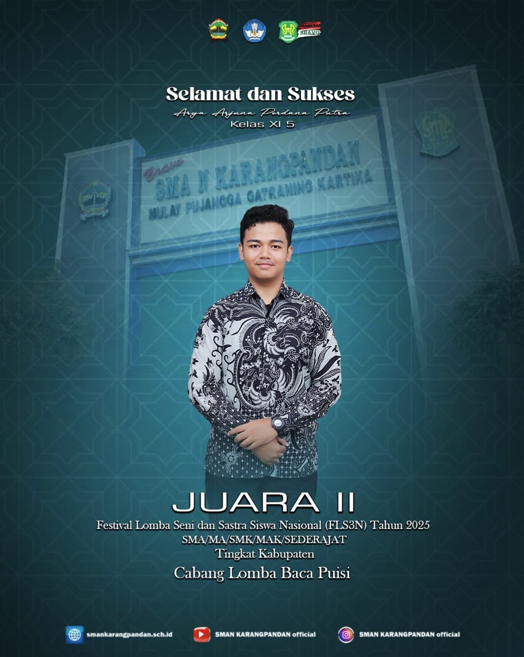 Kepala Sekolah, Bapak Santosa, M.Pd., mengapresiasi prestasi siswa-siswinya. “Ini bukti bahwa SMA Negeri Karangpandan tidak hanya fokus pada akademik, tetapi juga mendorong pengembangan bakat seni, sastra, dan literasi,” ujarnya.